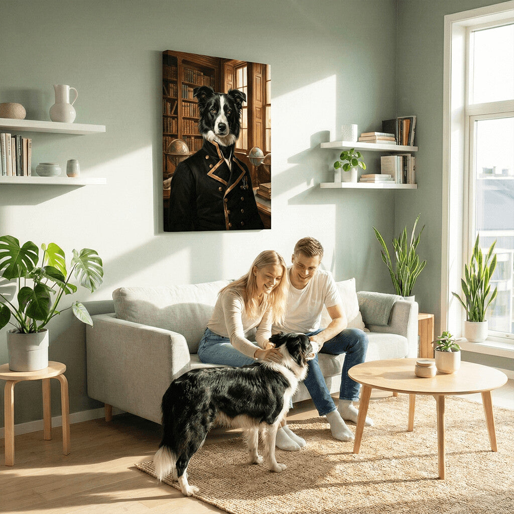 This refined, gallery-style canvas transforms your pet’s photo into a distinguished sea captain. Our artists dress your pet in a dark naval officer’s uniform, set within an atmospheric captain’s study surrounded by leather-bound books and navigational globes.