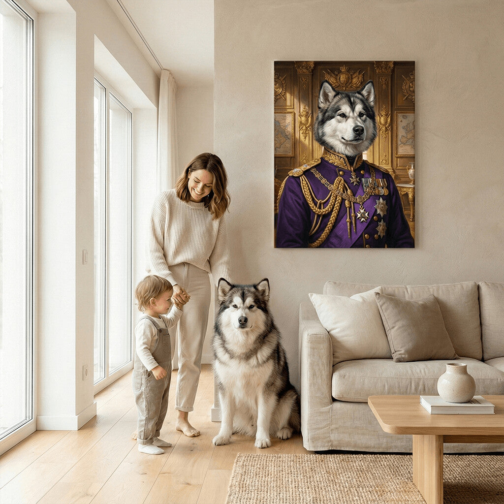 This grand, gallery-style canvas transforms your pet’s photo into a supreme field marshal. Our artists dress your pet in a striking purple ceremonial uniform with gold aiguillette and distinguished medals, set within a stately portrait gallery of military legends.