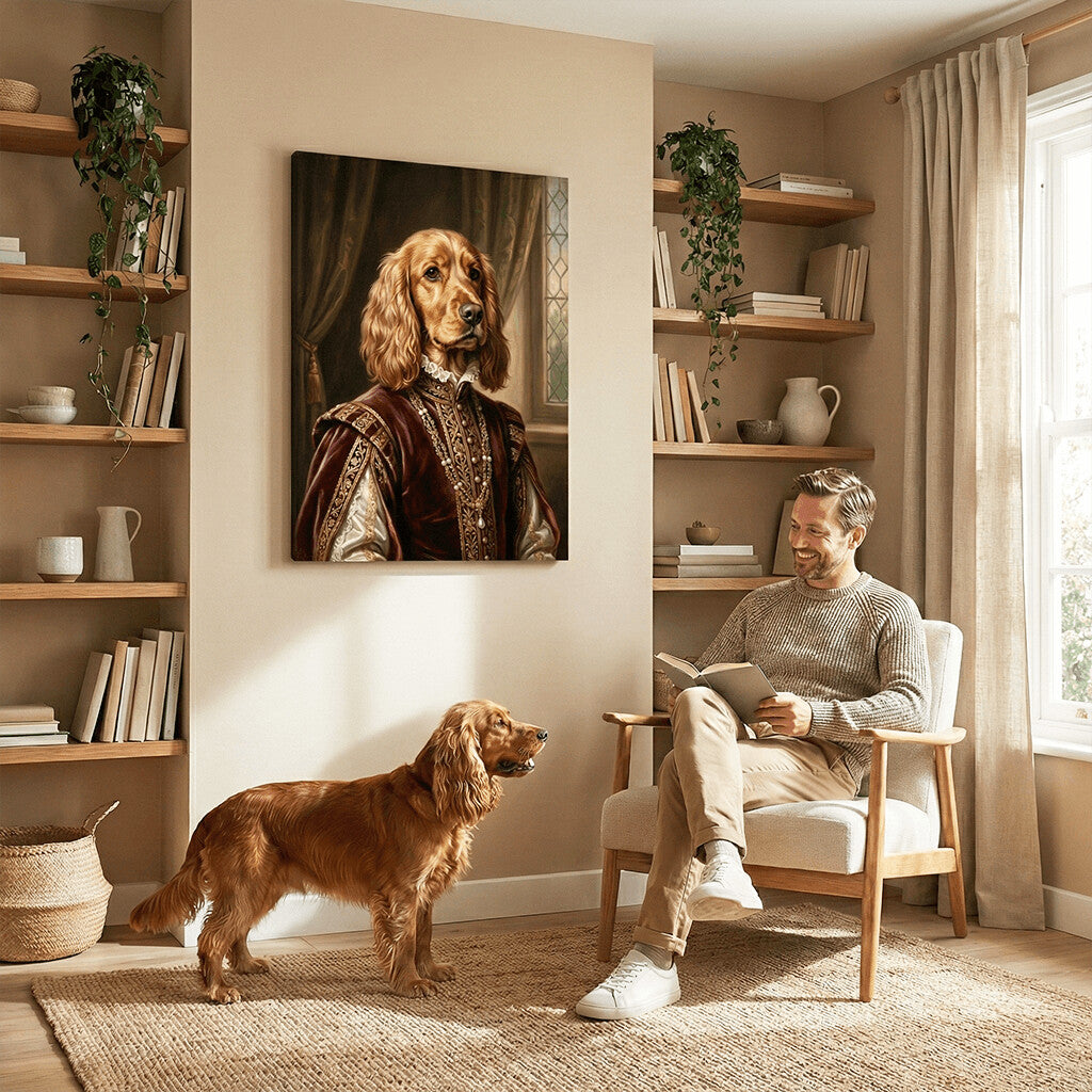 This opulent, gallery-style canvas transforms your pet’s photo into a wealthy Venetian merchant prince. Our artists dress your pet in luxurious burgundy and cream robes with golden embroidery, framed by a classical arch overlooking a sweeping Renaissance landscape.