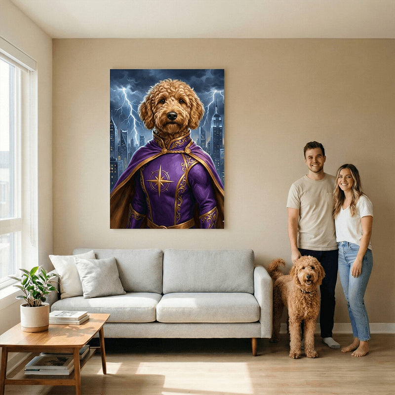 This epic, gallery-style canvas transforms your pet’s photo into a mighty mystic guardian. Our artists dress your pet in a flowing purple and gold cape with a glowing compass emblem, set against a dramatic lightning-streaked city skyline.