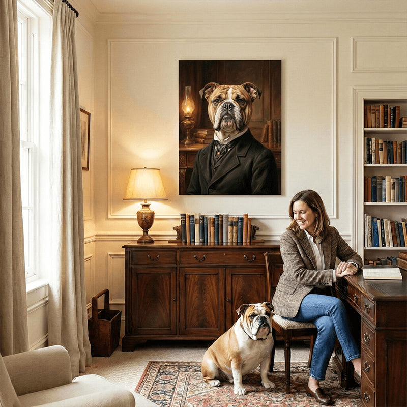 This refined, gallery-style canvas transforms your pet’s photo into a polished Victorian gentleman. Our artists dress your pet in a dark formal suit with a distinguished brooch, set within an elegant parlor with soft drapery, fine furniture, and warm lamplight.
