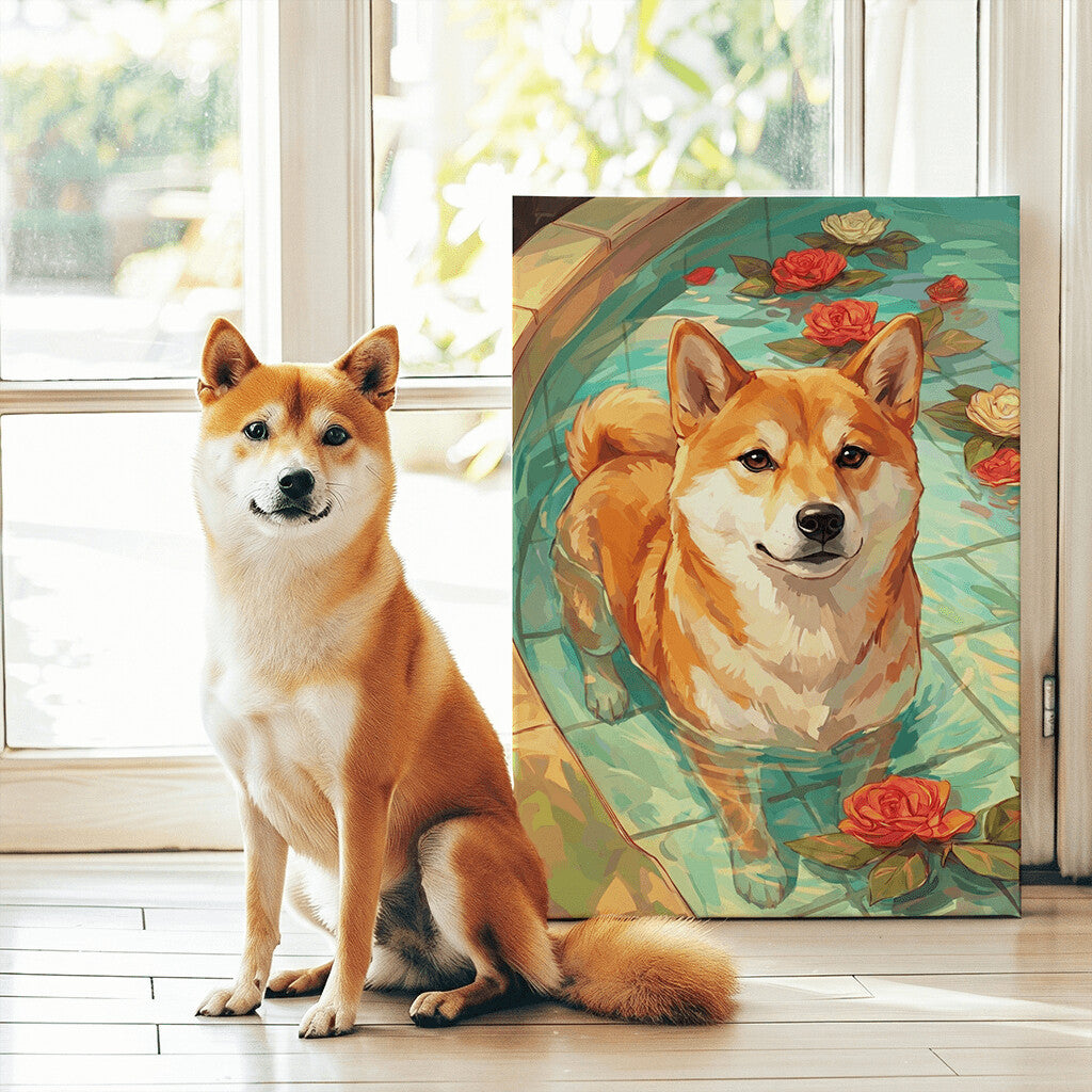 This beautiful, gallery-style canvas transforms your pet’s photo into a timeless vintage portrait. Our artists place your pet in a soft, romantic setting surrounded by lush roses and warm floral tones, evoking the charm of classic hand-painted portraiture.